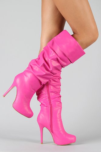 Your style deserves some edgy charm, so indulge in these fab knee high boots. Featuring smooth leatherette, oversized cuff, slouched shaft, almond toe, hidden platform, stiletto heel, stitching detail, full inner side zipper for easy on/off, and finished with smooth interior lining and cushioned insole.